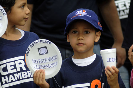 6月7日,在洪都拉斯首都特古西加爾巴,人們參加“零饑餓”大游行。當天,特古西加爾巴市市民以“零饑餓”為主題進行大規(guī)模游行,呼吁社會為消除饑餓和營養(yǎng)不良做出貢獻。據(jù)悉,由于國內(nèi)糧食產(chǎn)量的持續(xù)下滑和中美洲糧食緊缺局面的加劇,目前洪都拉斯國內(nèi)34座城市出現(xiàn)糧食供應問題,約有30萬名年齡在5歲以下的兒童營養(yǎng)不良,其中20萬營養(yǎng)不良兒童集中在相對貧瘠的洪都拉南部。目前,洪都拉斯政府正在尋求聯(lián)合國和中美洲鄰國的幫助,以求緩解國內(nèi)日益嚴重的糧食危機。 |
