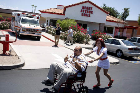 17日,在美國亞利桑那州錢德勒的“心臟病燒烤”餐廳,女服務(wù)員用輪椅推著用餐后的食客離開。這家漢堡店以提供醫(yī)院式的主題服務(wù)和四層超級漢堡兩大特色在當(dāng)?shù)匦∮忻麣狻?/P>