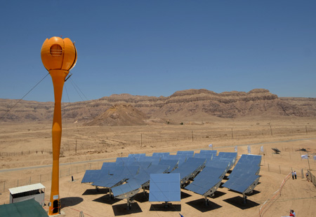這是24日在以色列南部內(nèi)蓋夫沙漠地區(qū)的薩瑪爾集體農(nóng)莊拍攝的太陽能混合熱電站。當(dāng)日,以色列正式啟用這個世界上首個太陽能混合熱電站。該電站通過30個能跟蹤太陽的反射鏡將陽光反射后集中在高塔接收器上,接收器將空氣加熱成高溫高壓蒸汽來推動汽輪發(fā)電機發(fā)電。當(dāng)陽光不充足時,該電站可以用燃油、天然氣等其他能源發(fā)電。該電站發(fā)電功率為100千瓦,可以供給70戶家庭用電。