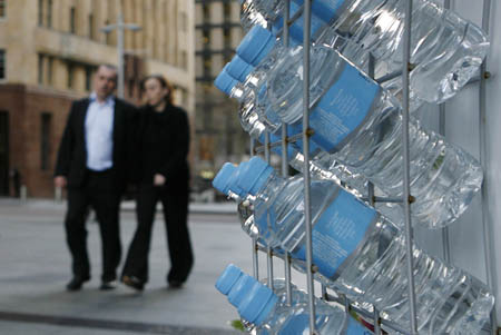 7月9日,2名市民走過澳大利亞悉尼一處賣瓶裝水的商鋪。針對使用瓶裝水對環(huán)境帶來的影響,澳大利亞新南威爾士州小鎮(zhèn)班達(dá)農(nóng)頒布全球首例禁止使用瓶裝水的法令。環(huán)保人士說,生產(chǎn)瓶裝水需使用大量塑料,而且在運(yùn)送過程中會消耗大量能源。