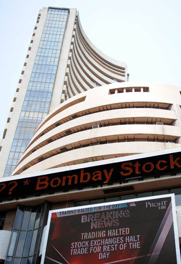 圖為印度孟買證券交易所大樓前的電子顯示屏顯示漲停的通告。新華社/法新