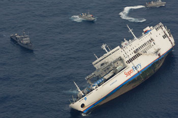 這張菲律賓海軍提供的圖片顯示,9月6日,在菲律賓南部的三寶顏半島附近海域,“超級客輪9”號發(fā)生傾覆,船上乘客在左舷避難。菲律賓海難救援官員6日說,一艘載有近千名乘客的客輪當(dāng)天凌晨在南部三寶顏半島附近海域傾覆,目前已確認(rèn)有3人遇難,88人失蹤。
