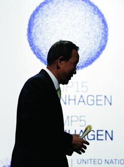 聯(lián)合國秘書長潘基文19日說,在哥本哈根舉行的聯(lián)合國氣候變化大會朝著正確的方向邁出了一步。新華社記者 曾毅 攝 |