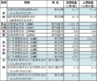 2010年第一周,國際大宗商品價(jià)格延續(xù)2009年最后一周上漲態(tài)勢。以油價(jià)和銅價(jià)漲勢最為明顯。 6日,美元對歐元、英鎊等主要貨幣匯率走低,抵消了美國原油商業(yè)庫存意外增加的影響,國際油價(jià)繼續(xù)上揚(yáng),紐約商品交易所一舉突破每桶83美元。截至當(dāng)日,國際油價(jià)已連續(xù)十個(gè)交易日上行,累計(jì)漲幅達(dá)14%,是1996年以來最長單邊上漲行情。 不過,美元對西方主要貨幣的比價(jià)7日上升,令以美元計(jì)價(jià)的原油期貨承壓,紐約、倫敦兩地油價(jià)當(dāng)天雙雙回落。截至8日收盤時(shí),紐約商品交易所2月份交貨的輕質(zhì)原油期貨價(jià)格,收于每桶82.75美元;倫敦北海布倫特原油期貨價(jià)格下跌38美分,收于每桶81.37美元。另外,雖然美國寒冷天氣仍在繼續(xù),但最新出臺的燃油商業(yè)庫存報(bào)告顯示各種油品供應(yīng)充足,原油庫存意外大幅上升,也使得油價(jià)缺乏上漲動(dòng)力。 當(dāng)周國際金價(jià)持續(xù)上漲,倫敦黃金市場價(jià)格當(dāng)周收盤價(jià)每盎司為1126.75美元,受印度央行大舉采購黃金和圣誕節(jié)、春節(jié)到來拉動(dòng)消費(fèi)的影響,國際金價(jià)出現(xiàn)快速上漲。 受智利銅礦工人罷工事件的影響,倫敦金屬交易所(LME)3個(gè)月期銅價(jià)格在周四(7日)一度飆升至7796美元/噸,這是自2008年8月以來最高水平。隨著全球經(jīng)濟(jì)回暖和中國銅需求的增加,銅價(jià)自2009年年初以來漲幅超過130%。 6日,紐約原油價(jià)格大幅走高,為玉米、小麥的上漲提供了利好的外部市場基調(diào)。分析人士稱,有關(guān)商品基金將調(diào)整持倉頭寸的預(yù)期推動(dòng)小麥價(jià)格上漲。美國商品期貨交易委員會持倉報(bào)告顯示,此前投機(jī)性基金持有大量小麥凈空頭頭寸。 在美國大豆收割結(jié)束后,南美大豆生長狀況成為市場關(guān)注的重點(diǎn)。氣象預(yù)報(bào)顯示,近期巴西、阿根廷的天氣有利于大豆生長,從而為芝加哥期貨交易所(CBOT)大豆價(jià)格走勢帶來壓力。