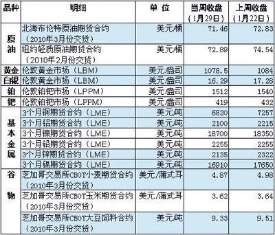 由于市場對中國有可能收緊貨幣政策的持續(xù)擔憂以及對世界宏觀經(jīng)濟的謹慎展望,當周多數(shù)大宗商品延續(xù)前一周跌勢。 國際油價當周繼續(xù)下跌,主要受美元走強等因素影響,美元對歐元匯率創(chuàng)6個月來新高。美國商務部1月29日發(fā)布報告說,2009年第4季度美國經(jīng)濟增長5.7%,連續(xù)第2個季度增長。該數(shù)據(jù)強化了市場有關美國經(jīng)濟將比其他發(fā)達國家更快復蘇的觀點,致使美元走強、油價下跌。另外,投資者對原油需求前景仍然存在疑慮,也對油價形成打壓。英國石油公司首席執(zhí)行官托尼·海沃德1月28日在達沃斯預測,今年石油價格將維持在每桶60美元至80美元之間。 當周美元走強和市場對稀有金屬價格繼續(xù)回落,國際金價已跌破每盎司1100美元。有報道援引興業(yè)銀行研究處資深黃金分析師蔣舒博士的話說,進入新年以來,全球經(jīng)濟形勢仍不明朗,一些主要經(jīng)濟體尤其是美國公布的重要經(jīng)濟數(shù)據(jù)直接影響了金價走勢。除鎳價有所上升之外,倫敦金屬交易市場其他基本金屬3個月期貨價格當周都在下跌,其中銅價降幅最大。 在觸及3個多月來低點后,芝加哥期貨交易所(CBOT)農(nóng)產(chǎn)品期貨28日小幅反彈。南美作物產(chǎn)量巨大繼續(xù)為市場帶來壓力。
