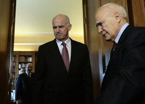 希臘總理向總統(tǒng)匯報即將采取的新的緊縮政策。3月3日,希臘總理喬治·帕潘德里歐(左)向總統(tǒng)帕普利亞斯匯報新的政策情況。