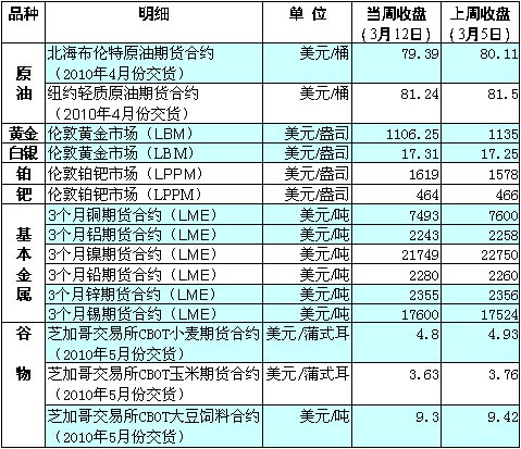 國(guó)際油價(jià)在當(dāng)周大宗商品價(jià)格變化中最為引人注目,11日震蕩上升越過82美元/桶后于12日小幅回落。11日收盤時(shí),紐約商品交易所4月份交貨的輕質(zhì)原油期貨價(jià)格上漲2美分,收于每桶82.11美元,連續(xù)第二天突破82美元,當(dāng)日倫敦市場(chǎng)北海布倫特原油期貨價(jià)格下跌20美分,收于每桶80.28美元。 分析人士指出,國(guó)際油價(jià)當(dāng)周的上升主要是受到投資者對(duì)需求的擔(dān)憂、美元走勢(shì)以及全球經(jīng)濟(jì)復(fù)蘇的預(yù)期等因素的影響。中國(guó)2月強(qiáng)勁的出口經(jīng)濟(jì)數(shù)據(jù)對(duì)市場(chǎng)也起了推升作用。 12日油價(jià)小幅回落主要受到美國(guó)消費(fèi)者信心指數(shù)和國(guó)際能源機(jī)構(gòu)對(duì)國(guó)際原油消費(fèi)預(yù)期的影響,密歇根大學(xué)與路透社公布的報(bào)告顯示,美國(guó)消費(fèi)者信心指數(shù)從2月份的73.6降至3月份的72.5。國(guó)際能源機(jī)構(gòu)調(diào)高了對(duì)今年國(guó)際原油需求的預(yù)期。該組織預(yù)計(jì),今年世界原油日消費(fèi)量有望增加7萬桶,達(dá)到8657萬桶。 國(guó)際金價(jià)8日自高點(diǎn)下滑。歐元兌美元走跌、2月份美國(guó)商品零售額意外增長(zhǎng)和投資者對(duì)希臘債務(wù)危機(jī)憂慮減緩等因素對(duì)金價(jià)走低起到了推動(dòng)作用。當(dāng)周貴金屬中,鈀價(jià)變化最為顯著,摸至近2年來的新高點(diǎn),達(dá)到480美元/盎司。鈀價(jià)飆升主要是因中國(guó)汽車銷售數(shù)據(jù)表現(xiàn)強(qiáng)勁。 受市場(chǎng)擔(dān)憂中國(guó)對(duì)銅需求下降以及龐大市場(chǎng)庫(kù)存影響,當(dāng)周國(guó)際銅價(jià)下降,而此前一周,由于美國(guó)就業(yè)數(shù)據(jù)好于預(yù)期及世界最大產(chǎn)銅國(guó)——智利遭受地震,銅價(jià)一度攀升。 當(dāng)周大豆價(jià)格面臨走低的壓力,由于出口銷售大幅下降,11日芝加哥期貨交易所(CBOT)大豆期貨遭遇重挫,5月合約下跌27.5美分,以每蒲式耳9.305美元收盤,盤中一度跌至9.29美元的4周低點(diǎn)。中國(guó)取消大量美國(guó)大豆進(jìn)口訂單以及南美大豆的豐產(chǎn)預(yù)期都為市場(chǎng)帶來壓力。10日,美國(guó)農(nóng)業(yè)部將巴西大豆產(chǎn)量由上月的6600萬噸上調(diào)至6700萬噸后,阿根廷布宜諾斯艾利斯谷物交易所當(dāng)天也將該國(guó)今年大豆產(chǎn)量由5200萬噸上調(diào)至5350萬噸。