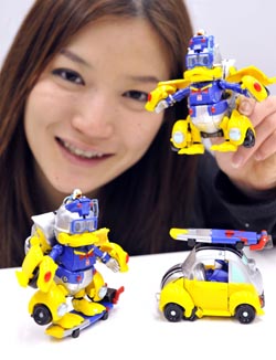2月16日,在日本東京,一名模特展示TOMY玩具公司新推出的“機(jī)器人”版“唐老鴨”。這款玩具可以將一輛小汽車變形為踩著沖浪板的機(jī)器“唐老鴨”。新華社/法新 |