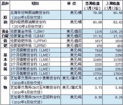 受當(dāng)周晚些時(shí)候美元匯率上升以及印度央行宣布加息的影響,倫敦市場(chǎng)金價(jià)小幅下跌。印度央行19日意外宣布加息以穩(wěn)定通脹預(yù)期,消息引發(fā)了投資者關(guān)于利率上升將削弱對(duì)包括貴金屬在內(nèi)的原材料需求的擔(dān)憂,加之印度是全球黃金消費(fèi)量最大的市場(chǎng)之一,因此引發(fā)黃金市場(chǎng)的拋售操作,推動(dòng)金價(jià)走低。 當(dāng)周國(guó)際油價(jià)圍繞每桶80美元關(guān)口波幅震蕩。受美元匯率走強(qiáng)等因素影響,國(guó)際油價(jià)15日全面回落,紐約油價(jià)跌至每桶80美元之下。此后的兩個(gè)交易日,受美元走軟、美聯(lián)儲(chǔ)繼續(xù)維持低利率政策和美國(guó)能源消費(fèi)需求回升等因素影響,國(guó)際油價(jià)接連上揚(yáng),17日紐約油價(jià)收盤時(shí)逼近每桶83美元。18日至19日,受美元對(duì)歐元匯率走強(qiáng)以及印度突然加息等因素影響,國(guó)際油價(jià)再度回落,紐約油價(jià)盤中跌破每桶80美元。 分析人士指出,當(dāng)周影響國(guó)際油價(jià)走勢(shì)的關(guān)鍵因素是美元匯率。由于在希臘債務(wù)危機(jī)問題上歐盟內(nèi)部意見不一,希臘表示可能尋求國(guó)際貨幣基金組織的幫助,導(dǎo)致美元對(duì)歐元匯率走強(qiáng),以美元計(jì)價(jià)的能源商品價(jià)格因此普遍回落。而美聯(lián)儲(chǔ)16日決定維持超低利率政策的消息,不僅導(dǎo)致16日至17日美元走軟,也刺激了市場(chǎng)的風(fēng)險(xiǎn)偏好(低利率條件下,投資者為獲得高回報(bào)會(huì)將更多資金投入原油期貨市場(chǎng)),為油價(jià)提供上行動(dòng)力。 除錫價(jià)略有上漲外,倫敦市場(chǎng)基本金屬價(jià)格全線走低。 以銅價(jià)為例,由于投資者擔(dān)心,中國(guó)這一全球最大銅消費(fèi)國(guó)可能收緊貨幣政策,以抑制經(jīng)濟(jì)過熱,這種憂慮令市場(chǎng)人氣受壓;加之全球最大的銅生產(chǎn)國(guó)——智利的主要銅礦在近幾周生產(chǎn)受擾后,日前已恢復(fù)生產(chǎn),這些都拖累銅價(jià)下滑。 芝加哥期貨交易所谷物期貨價(jià)全線上漲。由于美國(guó)北部大平原地區(qū)日前遭遇洪水,愛荷華、南達(dá)科他和北達(dá)科他幾個(gè)州的玉米和大豆播種面臨威脅,二者的期貨價(jià)格因此快速走強(qiáng)。此外,由于非商業(yè)性的投機(jī)資金持有大量?jī)艨疹^寸,投機(jī)商的空頭回補(bǔ)獲利繼續(xù)推動(dòng)小麥反彈。