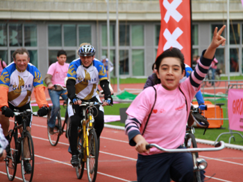 一個(gè)荷蘭小學(xué)生在“百萬(wàn)人同騎自行車(chē)活動(dòng)”中興奮地做出勝利的手勢(shì)。記者