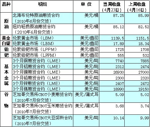 )原油期貨價格當(dāng)周初出現(xiàn)較大幅度回調(diào),周二(20日)受冰島火山灰影響各大航空公司紛紛取消航班,對需求的擔(dān)憂使得原油跌幅進一步擴大。周三(21日)商業(yè)庫存意外大幅上升也給原油價格構(gòu)成壓力。而美國新房銷售數(shù)據(jù)上升,提振了經(jīng)濟復(fù)蘇的樂觀情緒,令國際油價周五(23日)全面走高,紐約市場油價收于每桶85.12美元。 貴金屬方面,當(dāng)周鈀價創(chuàng)兩年來最高水平。巴克萊資本分析師庫珀認為,這主要是“由于投資創(chuàng)新紀錄以及中國進口強勁”。由于高盛被訴,導(dǎo)致美元走軟,國際金價當(dāng)周未能繼續(xù)上漲,周五,倫敦黃金市場金價跌至每盎司1139.5美元。 基本金屬當(dāng)周全線走跌。倫敦基本金屬價格多數(shù)小幅下挫,顯示市場還沒有完全從高盛事件中恢復(fù)過來。 受天氣因素以及投資者獲利了結(jié)的影響,芝加哥期貨交易所(CBO