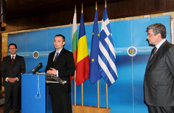 5月21日,羅馬尼亞外長巴孔斯基(右)、希臘代外長茲魯察斯(中)和保加利亞外長姆拉德諾夫在羅馬尼亞首都布加勒斯特出席記者招待會(huì)。當(dāng)天,三國外長在布加勒斯特舉行會(huì)晤,主要討論共同應(yīng)對當(dāng)前經(jīng)濟(jì)危機(jī)、加強(qiáng)地區(qū)各領(lǐng)域合作等問題。新華社記者