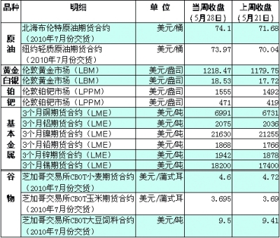 當周,在時局刺激下的黃金價格再度發(fā)力。西班牙主權債務情勢嚴峻,朝鮮半島局勢趨緊,倫敦市場金價在突如其來的動蕩中收復失地,當周收于每盎司1218.47美元。分析人士稱,大漲大跌、寬幅波動,恐怕會成為目前國際金市的常態(tài)。 國際油價呈震蕩走勢。由于投資者擔心歐元區(qū)債務危機蔓延,國際油價25日全面下挫,紐約、倫敦兩地7月份交貨的原油期貨價格雙雙跌破每桶70美元。受到美國原油消費上升、全球股市回升以及美國颶風季節(jié)來臨等因素刺激,國際油價在此后兩個交易日大幅回升。但國際油價28日再次出現(xiàn)回落,主要是受到美國經(jīng)濟數(shù)據(jù)不盡如人意以及西班牙主權信用等級被降低等因素影響。 業(yè)內(nèi)人士認為,如果世界經(jīng)濟不出現(xiàn)根本性變化,國際油價中長期或還將回升。美國奧本海默基金公司董事總經(jīng)理李山泉認為,雖然油價短期波動劇烈,但從中長期規(guī)律看,供求關系還將對價格起到主導作用?傮w而言,世界經(jīng)濟仍在復蘇過程中,世界主要經(jīng)濟體的情況都在好轉,盡管歐元區(qū)債務短期無法根本解決,但全球能源的需求上升或將推動油價回升! 倫敦基本金屬價格全線走高。分析人士稱,隨著近期市場逐步消化歐元債務危機的利空影響,在沒有出現(xiàn)新動態(tài)前,基本金屬走勢將回歸自身基本面。 當周芝加哥市場農(nóng)產(chǎn)品期貨價格波動明顯。由于投資者擔憂希臘債務危機的持續(xù)蔓延阻礙全球經(jīng)濟復蘇并降低農(nóng)產(chǎn)品的國際需求,芝加哥期貨交易所25日農(nóng)產(chǎn)品期貨價集體下滑。受美國制造業(yè)和新房銷售數(shù)據(jù)的強勁增長等外部利好消息影響,26日和27日農(nóng)產(chǎn)品期貨價格集體上漲。隨后,受外部市場利空以及良好天氣等因素的綜合影響,28日農(nóng)產(chǎn)品期貨價格止?jié)q轉跌,玉米、大豆、小麥7月合約分別創(chuàng)下5周、3周、2周以來最大跌幅。