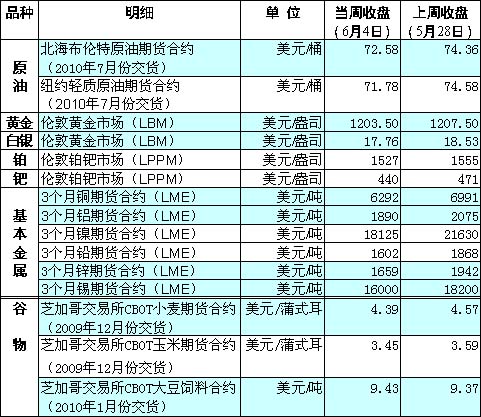 在歐元區(qū)主權(quán)債務(wù)危機持續(xù)影響下,歐元兌美元的比價當周跌破1歐元兌1.20美元關(guān)口,為2006年3月24日以來低點,造成以美元計價的國際大宗商品價格普跌。不過,由于投資者對全球經(jīng)濟前景憂心忡忡,作為投資避風港的黃金繼續(xù)受到市場追捧,盡管4日部分投資者獲利回吐,但國際金價仍在1200美元/盎司之上。 美國勞工部4日公布的非農(nóng)就業(yè)數(shù)據(jù)未及預(yù)期,市場普遍認為,高失業(yè)率將成為經(jīng)濟復蘇的重大障礙。受此影響,國際油價重跌。當日收盤時,紐約商品交易所7月份交貨的輕質(zhì)原油期貨價格下跌3.10美元,收于每桶71.51美元。倫敦市場北海布倫特原油期貨價格下跌3.32美元,收于每桶72.09美元。 歐元走弱令投資者更加青睞美元和黃金,后者價格雖然時有小幅回調(diào),但仍處高位,分析師普遍認為,如果投資者情緒不發(fā)生轉(zhuǎn)變,未來金價將以1200美元/盎司為新起點而繼續(xù)上攻之勢。 由于主要消費國中國的制造業(yè)數(shù)據(jù)令市場擔心未來需求疲弱,導致倫敦金屬市場上基本金屬價格紛紛下挫。 市場中為數(shù)不多的亮點來自可可。由于供應(yīng)形勢緊張而需求預(yù)期大增,倫敦市場上可可期貨價格上揚,逼近33年來峰值。 歐元對美元比價跌破重要關(guān)口的消息還令國際農(nóng)產(chǎn)品價格承壓。此外,美國農(nóng)業(yè)部4日公布的農(nóng)產(chǎn)品周度出口銷售報告顯示,截至5月27日前的一周,美國私人出口商共出口銷售31.3萬噸玉米,遠遠低于70至100萬噸的市場預(yù)期。小麥和大豆的周度出口銷售量分別為24.11萬噸及14.81萬噸,也均不及市場預(yù)期。糟糕的出口數(shù)據(jù)成為芝加哥期貨交易所農(nóng)產(chǎn)品期貨價格暴跌的一大因素——當日小麥期價觸及3年以來的新低,大豆期價創(chuàng)4周以來最大跌幅,玉米期價觸及8個月以來的低點。