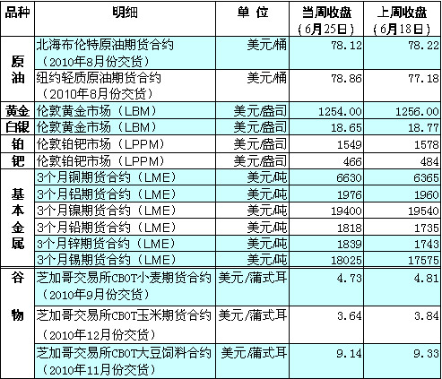 受投資者擔(dān)心颶風(fēng)季節(jié)來臨可能影響美國墨西哥灣石油生產(chǎn)的影響,25日紐約市場原油期貨價格全天漲幅超過3%,自5月初以來首次收于每桶78美元以上。同時,國際油價還受到了利好經(jīng)濟(jì)數(shù)據(jù)的支撐。密歇根大學(xué)與路透社當(dāng)天公布的聯(lián)合報告顯示,6月份美國消費(fèi)者信心指數(shù)上升至兩年來的最高水平。此外,美元對歐元匯率當(dāng)天繼續(xù)走軟,也對以美元計價的大宗商品價格構(gòu)成支撐。 由于投資者在二十國集團(tuán)峰會召開前保持謹(jǐn)慎以及美元匯率盤中下跌,紐約商品交易所25日黃金期貨8月合約收于1256.2美元,接近18日創(chuàng)下的每盎司1258.3美元的收盤價歷史高點。 美國商務(wù)部25日公布的數(shù)據(jù)顯示,今年第一季度美國國內(nèi)生產(chǎn)總值環(huán)比漲幅為2.7%,低于上月公布的修正值以及市場普遍預(yù)期的3.0%,加之一周以來接連公布的一系列不及預(yù)期的經(jīng)濟(jì)數(shù)據(jù),投資者對美國經(jīng)濟(jì)復(fù)蘇前景的憂慮進(jìn)一步加深。此外,擔(dān)保希臘國債違約成本25日早些時候觸及歷史新高,令投資者更加擔(dān)憂歐洲經(jīng)濟(jì)復(fù)蘇前景,以及財政緊縮政策將使深陷債務(wù)危機(jī)的歐元區(qū)國家面臨債務(wù)重組。投資者對二十國集團(tuán)峰會的謹(jǐn)慎觀望態(tài)度也推動黃金和美國國債等避險資產(chǎn)價格攀升。 芝加哥農(nóng)產(chǎn)品期貨價格當(dāng)周較前一周普遍下跌。受良好天氣因素打壓,芝加哥期貨交易所25日小麥期價創(chuàng)下3周以來的最大跌幅,玉米期價連續(xù)第五個交易日走低。大豆方面,由于美國農(nóng)民銷售大豆進(jìn)度緩慢,令舊作大豆供應(yīng)緊張,堅挺的現(xiàn)貨市場以及美元匯率全面下跌抵消了理想天氣條件對大豆期價的打壓,令其價格與前一個交易日持平。