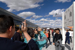 乘火車進藏的旅客在那曲車站拍照留念。本報記者 唐召明 攝 |