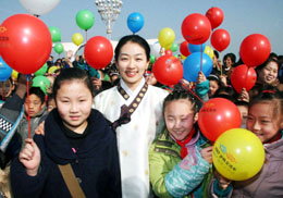 2月7日,煙臺小朋友和一名韓國旅游小姐合影留念。當日,中韓旅游交流活動啟動儀式在山東煙臺濱海廣場舉行,中韓兩國旅游界人士及觀眾近千人參加了啟動儀式。