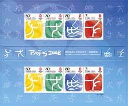 目前已經有“會徽”與“吉祥物”小版張、“會徽與吉祥物”不干膠小版張、“奧運項目”不干膠小版張等郵品上市!皶铡迸c“吉祥物”小版張、“會徽與吉祥物”不干膠小版張2005年11月12日發(fā)行,自上市以來就在市場中扮演了無可比擬的角色。