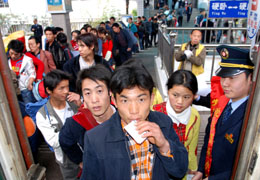 2月24日,準(zhǔn)備乘坐農(nóng)民工專列的貴州省貞豐縣農(nóng)民工通過檢票口。 當(dāng)日,貴州鐵路部門為貞豐縣上千名農(nóng)民工加開貴陽到上海的農(nóng)民工專列,受到農(nóng)民工的歡迎。新華社發(fā)(肖帆