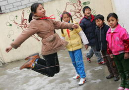 3月16日,惠民中心學(xué)校四年級(jí)一班的陳敏(左)正和伙伴們?cè)谛虏賵?chǎng)上跳皮筋。 為確保農(nóng)民工子女學(xué)校師生安全和健康,上海市教委近日出臺(tái)專門(mén)文件,以專項(xiàng)經(jīng)費(fèi)支持形式,重點(diǎn)改善農(nóng)民工子女學(xué)校教室照明以及食堂、廁所等基本設(shè)施設(shè)備,進(jìn)一步優(yōu)化校園環(huán)境。到今年8月31日之前,277所農(nóng)民工子女學(xué)校辦學(xué)條件將大大改善,滬上18萬(wàn)農(nóng)民工子女將擁有更好的求學(xué)環(huán)境。 |