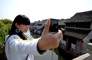 一名游客在江南古鎮(zhèn)西塘體驗浙江經(jīng)濟(jì)發(fā)展帶來的新風(fēng)貌。本報記者 王小川 攝