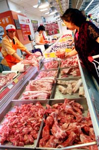 上海豬肉價格漲至近年來最高點,同比上漲七成左右。消費者在上海一家大型超市內(nèi)選購生豬肉。本報記者:劉穎 攝 |