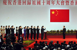 7月1日,慶祝香港回歸祖國十周年大會(huì)暨香港特別行政區(qū)第三屆政府就職典禮在香港會(huì)展中心舉行。這是香港特別行政區(qū)第三屆政府的主要官員在曾蔭權(quán)帶領(lǐng)下宣誓就職,胡錦濤主席監(jiān)誓。新華社記者:公磊 攝