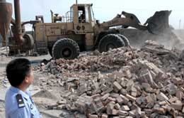 日前,寧夏石嘴山市開展打擊取締土煉鋅專項(xiàng)行動。圖為鏟車在拆除寧夏石嘴山市惠農(nóng)區(qū)一家土煉鋅工廠。新華社記者:王鵬