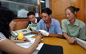 | 重慶首個農(nóng)民工法律援助站受歡迎。8月17日上午,三名農(nóng)民工在法律援助站向律師胡佳(左)進(jìn)行咨詢。 新華社記者