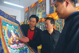 青海省黃南藏族自治州同仁縣熱貢藝人增他加(左)在向游客介紹他的“唐卡”作品。本報記者:楊壽德
