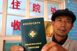 2007年,新型農(nóng)村合作醫(yī)療制度已經(jīng)覆蓋甘肅全省所有農(nóng)村人口,參合人數(shù)達(dá)到1780萬人。圖為甘肅省白銀市平川區(qū)水泉鎮(zhèn)下村農(nóng)民白江正在展示自家的“新型農(nóng)村合作醫(yī)療證”。新華社記者:張錳