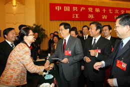 10月16日,胡錦濤同江蘇代表團(tuán)代表一起審議黨的十七大報告。這是胡錦濤同來自基層的代表親切交談。 新華社記者:樊如鈞
