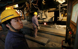 吉林省通化鋼鐵集團(tuán)結(jié)構(gòu)調(diào)整產(chǎn)品升級(jí)技術(shù)改造工程日前正式竣工投產(chǎn)。截止到目前,通鋼股份公司大型化改造的主體工程已陸續(xù)改造完成并投產(chǎn),600萬(wàn)噸鋼生產(chǎn)能力已全面形成,該工程的竣工投產(chǎn)標(biāo)志著通鋼集團(tuán)結(jié)構(gòu)調(diào)整和產(chǎn)品升級(jí)登上了一個(gè)新的臺(tái)階。2007年1至9月份,通鋼集團(tuán)實(shí)現(xiàn)工業(yè)總產(chǎn)值138.9億元,比去年同期增長(zhǎng)24.75%。圖為工人正在生產(chǎn)線上緊張忙碌。 |