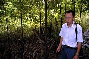三峽珍稀植物園創(chuàng)建者向秀發(fā)在去年旱死的一片野生枸杞樹前痛心不已。這個植物園自2002年建設(shè)以來,就因體制不順、無主管部門而缺乏資金來源。今年6月,已負(fù)債30萬元的向秀發(fā)無力支撐,被迫關(guān)閉植物園,園內(nèi)珍稀植物面臨各種災(zāi)害威脅。本報記者
