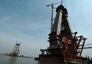 | 建設(shè)中的武漢天興洲長江公鐵兩用橋。本報記者 程敏