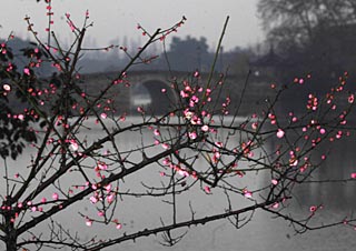 | 西湖風(fēng)景區(qū)內(nèi)的盛開的紅梅吸引了眾多游客前去觀賞。新華社記者 徐昱