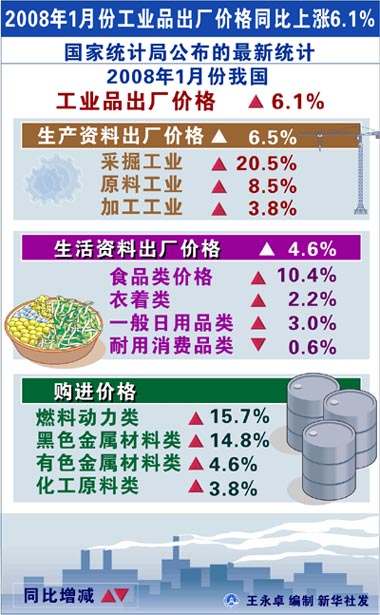 2008年1月份工業(yè)品出廠價格同比上漲6.1%