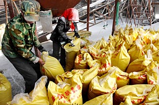 | 寧夏賀蘭縣化肥廠工人在生產(chǎn)車(chē)間包裝碳酸氫氨。新華社記者 李紫恒