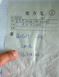4月22日,執(zhí)法人員展示一份銷售“易瑞沙”藥品的處方箋,上面顯示一瓶銷售2500元。新華社記者:鞏志宏