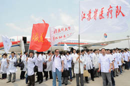 5月13日,由103名醫(yī)護(hù)人員組成的江蘇省醫(yī)療隊(duì)奔赴四川地震災(zāi)區(qū),并隨機(jī)帶去5噸多藥品、器械等醫(yī)療物資以及20萬毫升血液。