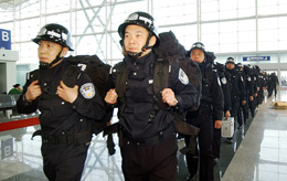 5月13日中午12點(diǎn),200名天津特警及兩名隨隊(duì)醫(yī)生攜帶照明、破拆和通訊工具,飛赴四川重災(zāi)區(qū),開展搶險(xiǎn)救援工作。