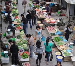 甘肅省隴南市努力做好各項(xiàng)生活必需品供應(yīng),確保因汶川地震而受災(zāi)的群眾生活不出問題。5月13日,甘肅省隴南市武都區(qū)的居民在一個菜市場內(nèi)買菜。 新華社記者:韓傳號