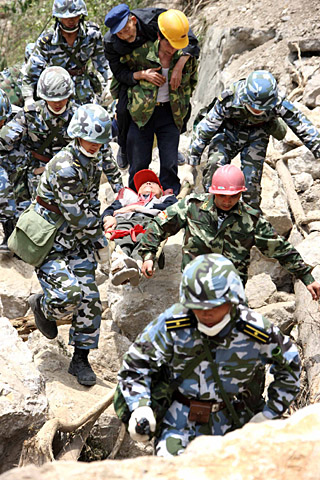 | 5月18日,海軍陸戰(zhàn)隊官兵在轉(zhuǎn)移受災(zāi)群眾。地震發(fā)生后,有400多名群眾在轉(zhuǎn)移途中被困在大山深處的清平鄉(xiāng)高橋路段,缺水斷糧。18日清晨6時,由海軍陸戰(zhàn)隊兩棲偵察隊50名骨干隊員組成的救援突擊隊,徒步十多公里的塌方山路,排除千難萬險,攀越多處塌方路段,采取分組接力的方法,火速轉(zhuǎn)移群眾。截至發(fā)稿時,救援突擊隊將綿竹天池鄉(xiāng)和清平鄉(xiāng)83名因地震被困6天的群眾成功營救到安全地帶。新華社記者