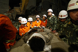 | 5月16日22時40分,經(jīng)過長達13個小時的營救,河南消防官兵在四川什邡市成功救出一名被埋長達104小時的幸存者。這名幸存者生命體征穩(wěn)定,基本沒有外傷。這是獲救者被抬出。新華社發(fā)(康建國