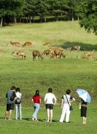 昔日地廣人稀、寒冷原始的“北大荒”,如今隨著各類(lèi)天然而充滿(mǎn)特色的旅游項(xiàng)目開(kāi)發(fā),正在成為中國(guó)新的旅游勝地。圖為游客們?cè)谝链菏幸粋(gè)天然鹿場(chǎng)觀賞鹿群。 |