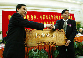 圖為2003年4月,在北京舉辦的授予廣東省中山市大涌鎮(zhèn)“中國紅木家具生產(chǎn)專業(yè)鎮(zhèn)”榮譽(yù)稱號(hào)儀式的資料照片。新華社記者 安治平
