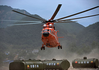 | 5月31日,在四川省北川縣擂鼓鎮(zhèn),有“巨無(wú)霸”之稱的米—26多用途重型運(yùn)輸直升機(jī)剛剛完成搶險(xiǎn)設(shè)備吊運(yùn)任務(wù)。新華社記者