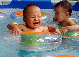 | 7月10日,在育兒專家及專業(yè)嬰兒護理人員輔導(dǎo)下,13個月大的幼兒琛琛(前)和小伙伴一起,在水中嬉戲。新華社記者 張旭