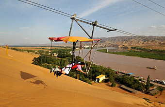 | 游客在寧夏沙坡頭風(fēng)景區(qū)的空中索道上“飛翔”。 |