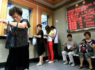 9月2日,一些患者在上海市普陀區(qū)某公立醫(yī)院藥房取藥。2008深化醫(yī)院管理年活動(dòng)暨全國醫(yī)政工作會(huì)議傳出信息,我國將選擇部分城市進(jìn)行公立醫(yī)院改革試點(diǎn),要改革以藥養(yǎng)醫(yī)機(jī)制,有效降低群眾醫(yī)藥負(fù)擔(dān)。